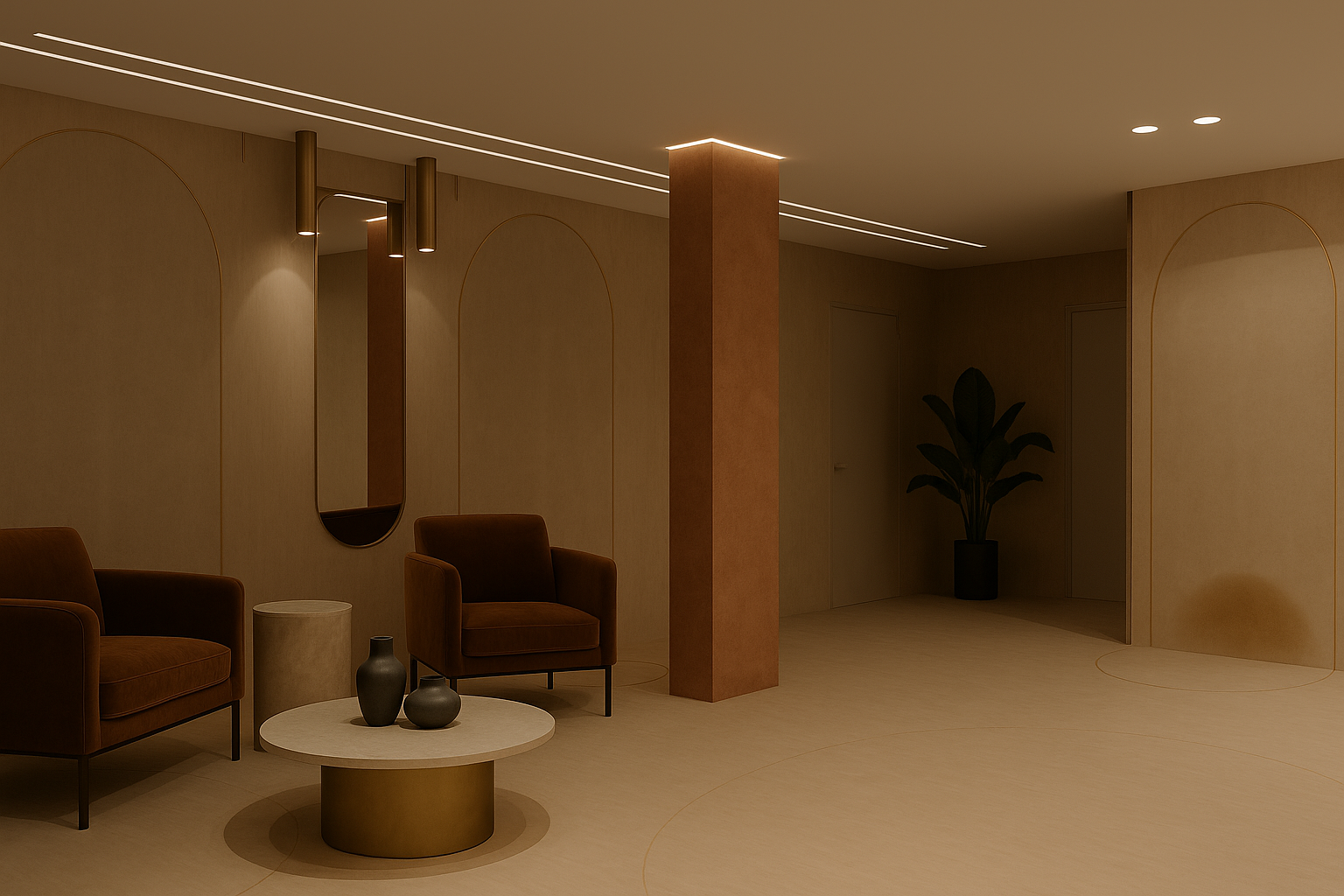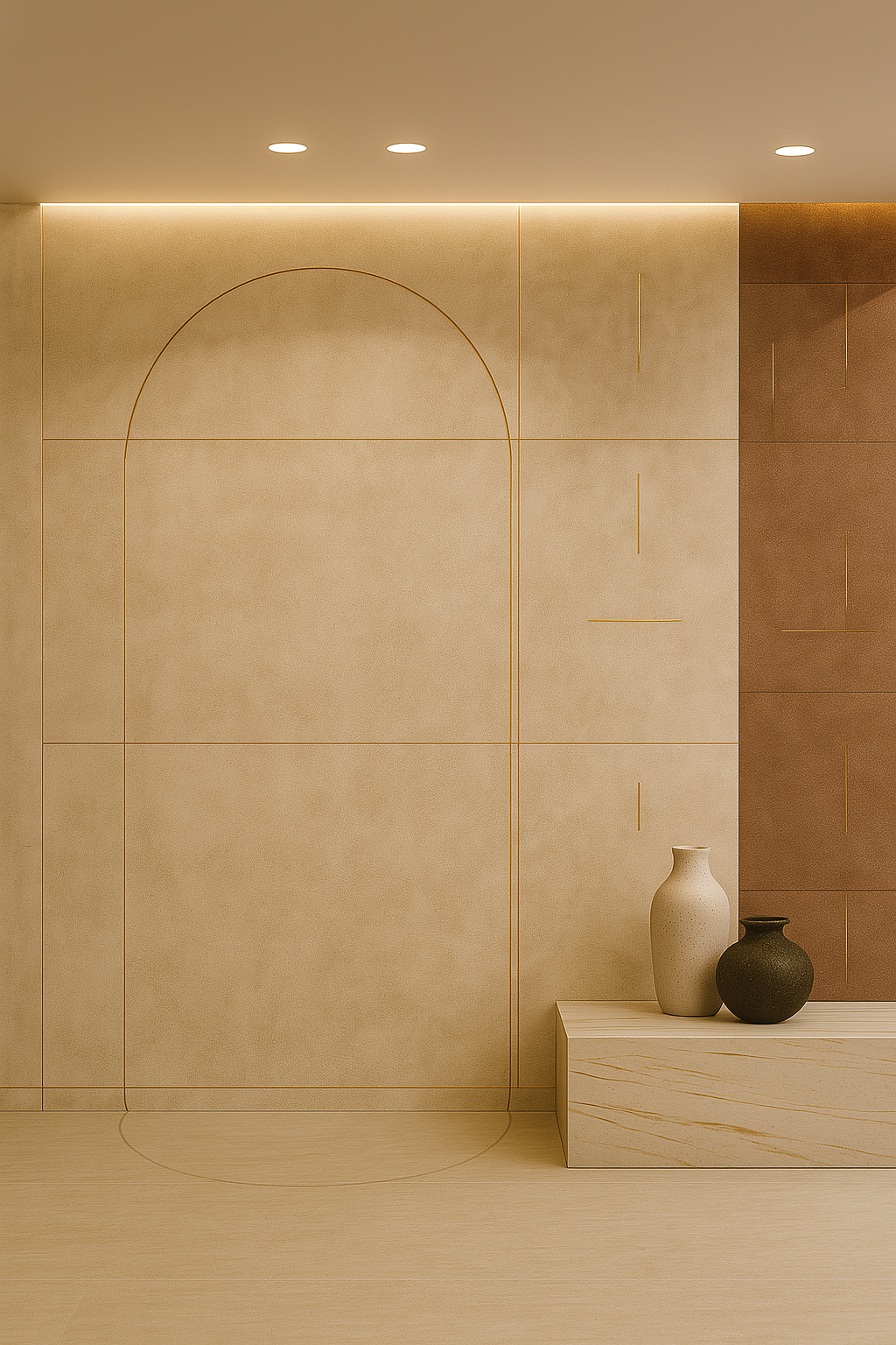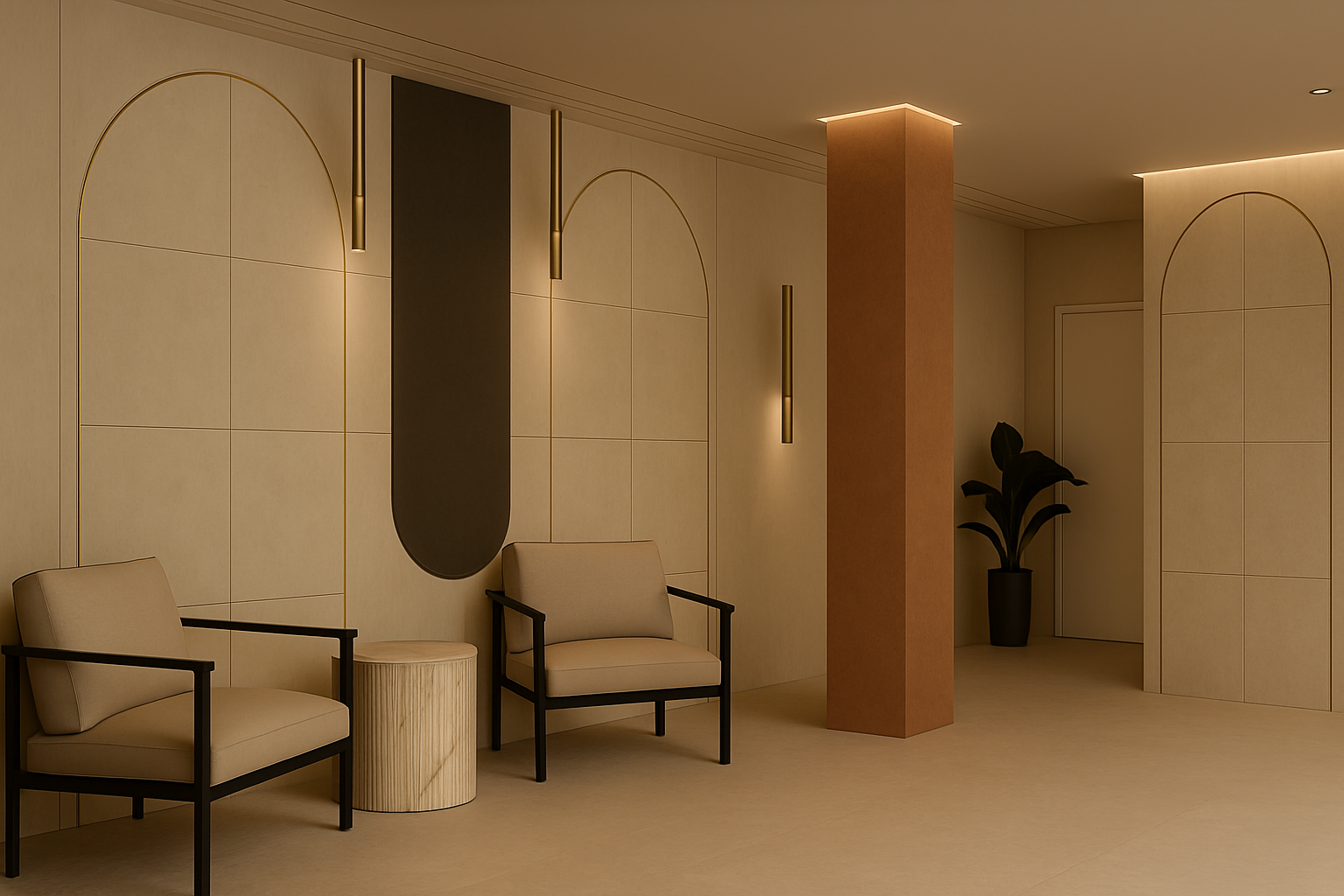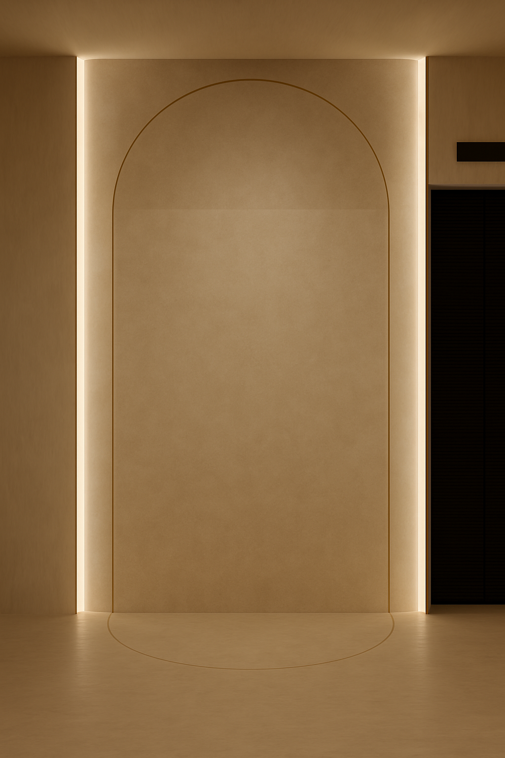 לובי צוקי כנרת בטבריה תוכנן מתוך שפה חומרית אחת, המבוססת על סדרת פורצלן אחידה במספר גדלים: 120×120 לריצוף, ו־60×120, 90×90 ו־60×60 לחיפויי הקירות. העבודה עם גדלים שונים אפשרה התאמה מדויקת לגאומטריית החלל ויצירת צורניות מבוקרת באמצעות כפולות והרכבות חוזרות של האריחים. בתוך המהלך שולב ספסל ישיבה כחלק אינטגרלי ממבנה הלובי, בהשראת ספסלי האבן הקבועים של המרחב הציבורי ההיסטורי — פתרון פונקציונלי המוטמע בחיפוי וממשיך את קו החומר. קשתות צורניות שובצו כחלק בלתי נפרד ממערכת החיפוי, בפרופורציות וגוונים שמאזכרים את קשתות האבן של טבריה ההיסטורית. הצורניות נבנתה מאריחים מודולריים בלבד (60×60) ונמשכת מהרצפה אל הקיר בקו מתוכנן — כך שהעיצוב כולו נוצר מתוך החומר עצמו, ללא צורך באלמנטים דקורטיביים נוספים.